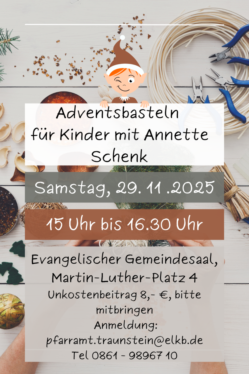 Alle Jahre wieder ... kommt das Adventsbasteln für Kinder mit Annette Schenk. Auch am Samstag, den 29. 11. 2025 von 15.00 Uhr bis 16.30 Uhr im Saal am Martin-Luther-Platz 4. Anmeldung wieder im Pfarramt: Pfarramt.Traunstein@elkb.de oder auch per Telefon 0861 - 9896710